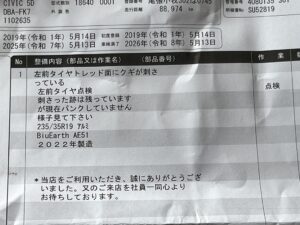 先日、両親をシビックちゃんに乗せて鰻を食べに行ったんですが、到着して駐車場で親がタイヤにクギネジ?が刺さっているのを発見。接地面、トレッドパターンのところなのですぐに影響はないですし、抜かなければ空気がすぐに漏れることはないので一旦そのままに。